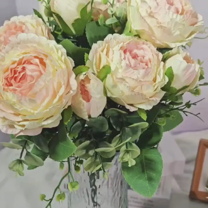 Blomster og blader er av stoff, mens grenene er av plast, som inneholder jerntråd slik at du dandere buketten slik du ønsker.